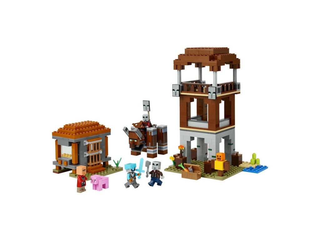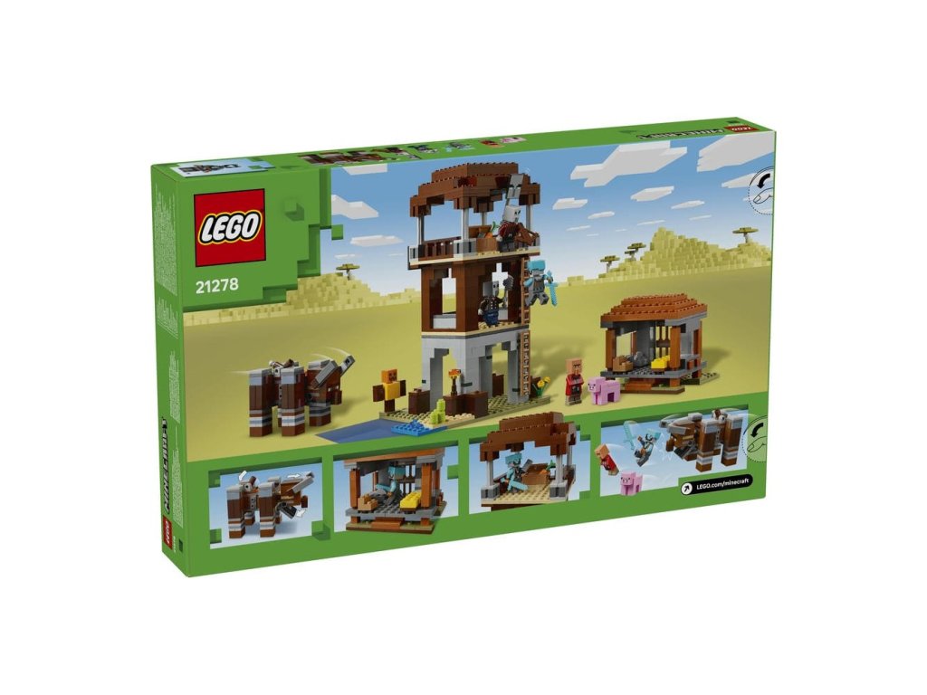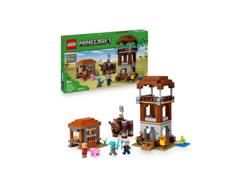 Stavebnice Základna plenitelů a Ničitel (21278) představuje kreativní videoherní dárek pro děti, které mají rády stavebnice, dobrodružství LEGO® Minecraft a dekorace do pokojíčku. S touto kvalitní hračkou si děti od 9 let užijí velkou porci zábavyze světa Minecraftu. Stavebnice obsahuje 4 minifigurky LEGO Minecraft: vesmírného strážce, kapitána nájezdu, vesničana zedníka a mstitele. Sestavitelná figurka Ničitele má funkci ovládanou pákou, která dětem umožňuje provádět pohyby, při kterých figurk a práská čelistí a naráží hlavou. Strážní věž obsahuje žebříky, které umožňují přístup do tří pater, prapory s tvářemi plenitelů a truhlu s drahocennou kořistí. Dům zedníka má otevírací dveře a zařízený interiér s postelí a řezačkou kamení. Součástí je také figurka prasete LEGO Minecraft a doplňky včetně cvičné figuríny, pochodně, mrkve, železného ingotu, diamantové helmy, diamantového meče, kuše a železné sekery. S aplikací LEGO Builder si děti užijí ještě větší porci zábavy a umožní jim na zařízení přibližovat a otáčet modely ve 3D. Součástí je 665 dílků.