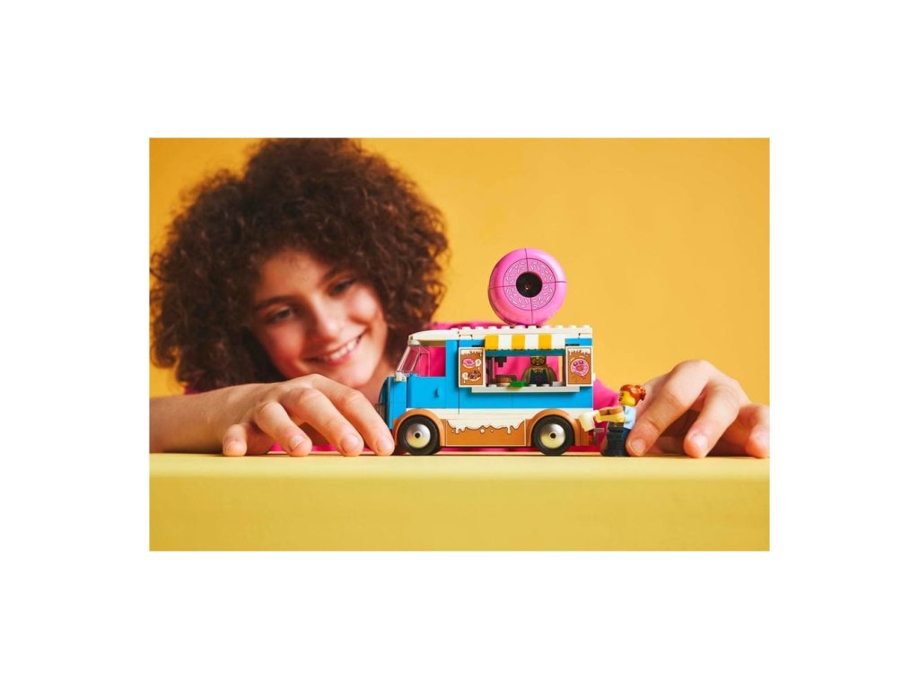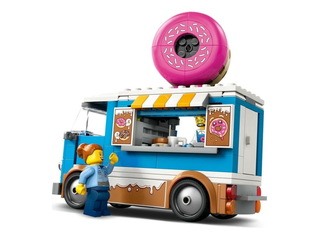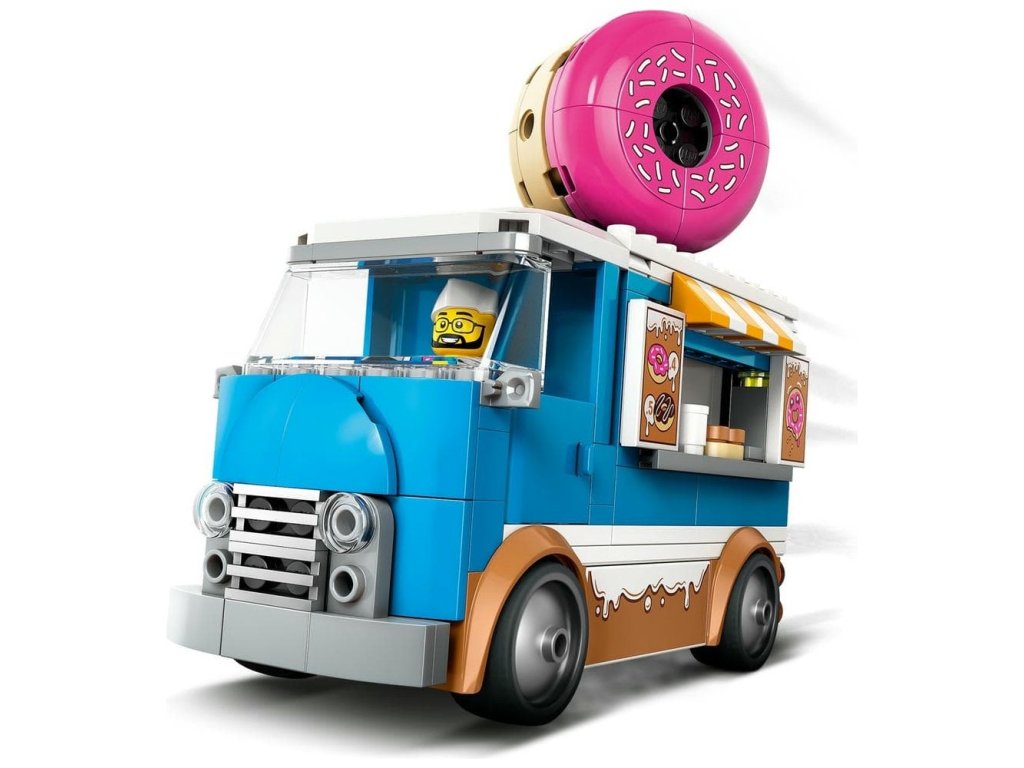 Připravte Truck s donuty a vydejte se do LEGO® City! Tato dodávka s odnímatelným kioskem je vážně něco! Prohlédněte si ozobu v podobě polevy a obří donut na střeše. V kuchyňce připravte chutné donuty a hladovým zákazníkům servírujte čerstvě dobroty a lahodné horké nápoje. Až budete připraveni jet dál, usedněte za volant a vydejte se se svou parádní mobilní kavárnou do další destinace!