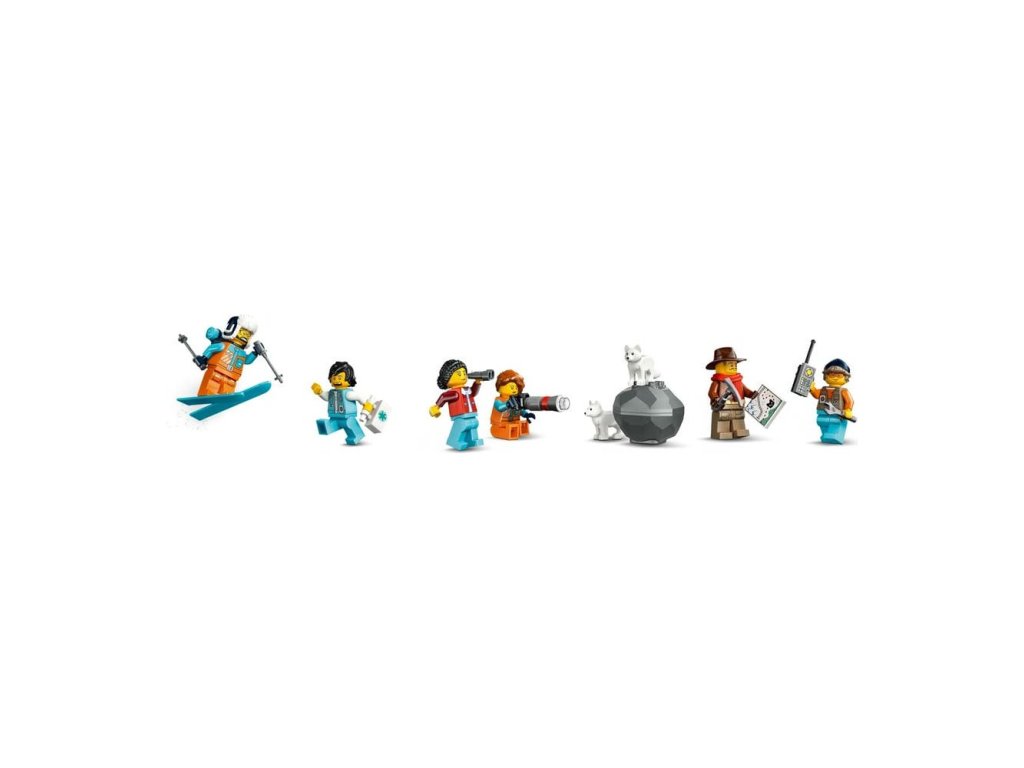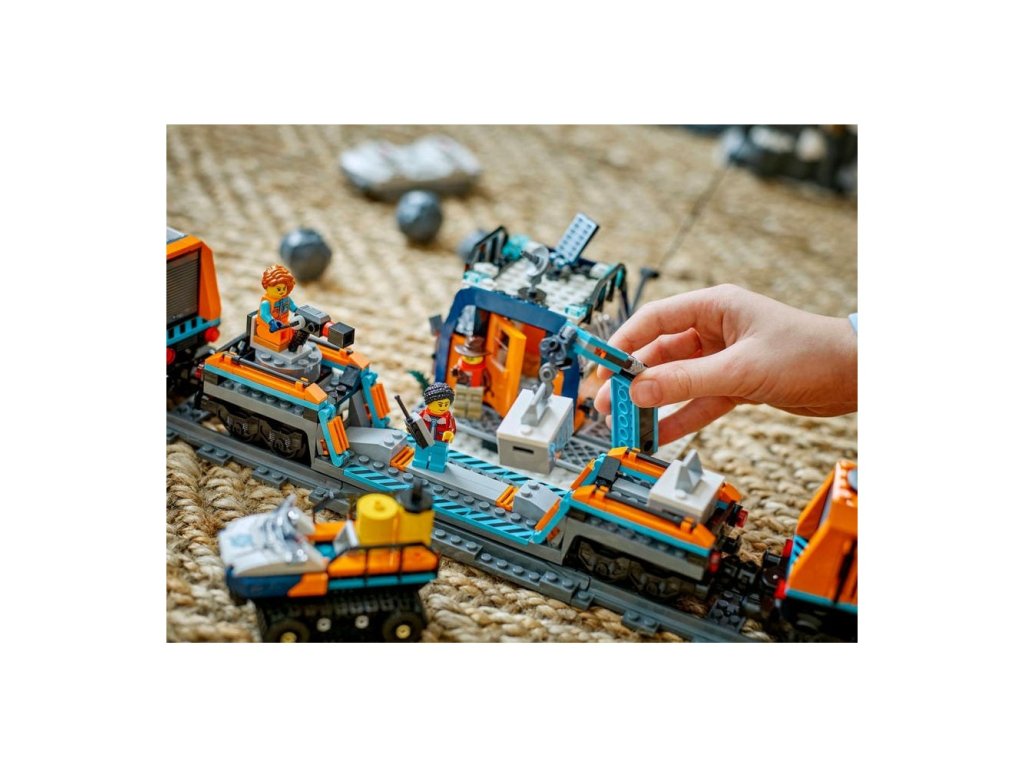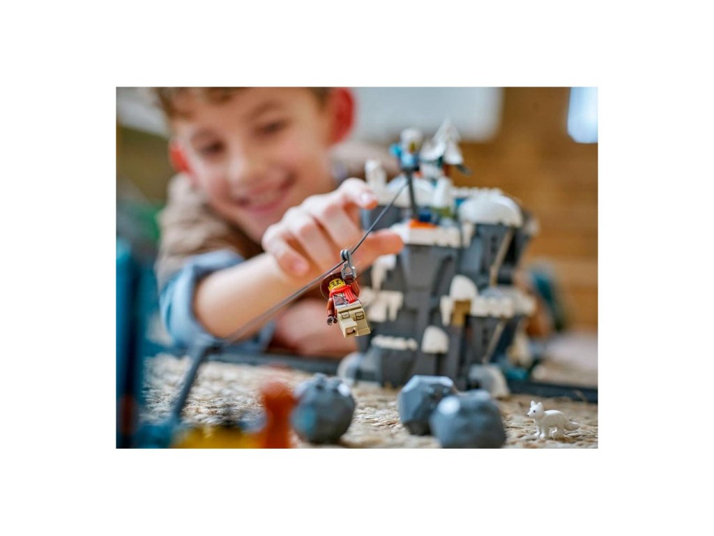 • Vlastnosti a funkce – Děti můžou projet s vláčkem horským tunelem, aktivovat funkci padajícího kamení a poslat minifigurky dolů po lanové dráze, která spojuje horu s arktickou základnou