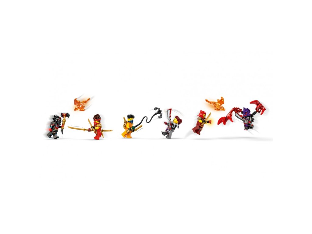 • 6 minifigurek NINJAGO® – Tato nindžovská stavebnice obsahuje nindža válečníky Kaie, Wyldfyre a Arina, a k tomu navíc padouchy Lorda Rase, Jordanu a válečníka s vlčí maskou. Každá minifigurka má vlastní zbraň