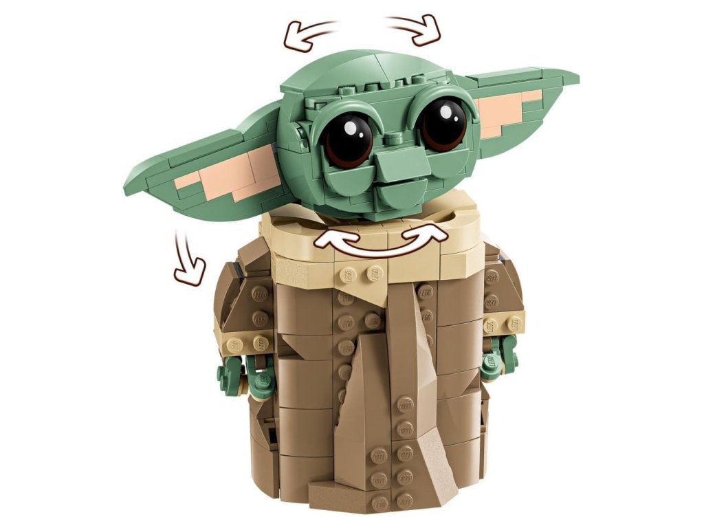 Ukažte světu svou lásku ke Groguovi! Ovládejte Groguovy paže pomocí otočných knoflíků a napolohujte jeho hlavu a uši. Dejte mu do rukou sorganskou žábu (jeho oblíbenou svačinku!), knoflík řadicí páky nebo makronku a vystavte ho v kočárku nebo bez něj. Přidejte informační cedulku s figurkou LEGO® Grogua ve standardní velikosti v malém kočárku z kostek a roztomilý model si vystavte.