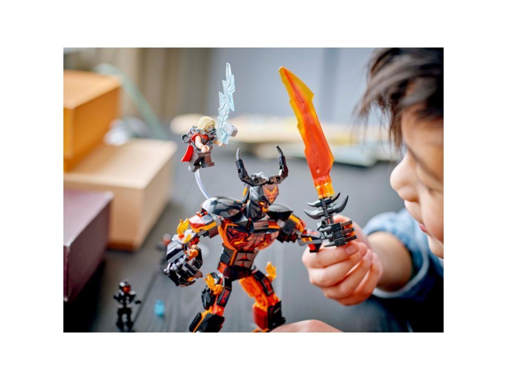 • Stavebnice pro děti Avengers: Thor vs. Surtur – Minifigurka superhrdiny bojuje s obří sestavitelnou figurkou s plamenným mečem v této stavebnici LEGO® Marvel pro kluky a holky od 8 let