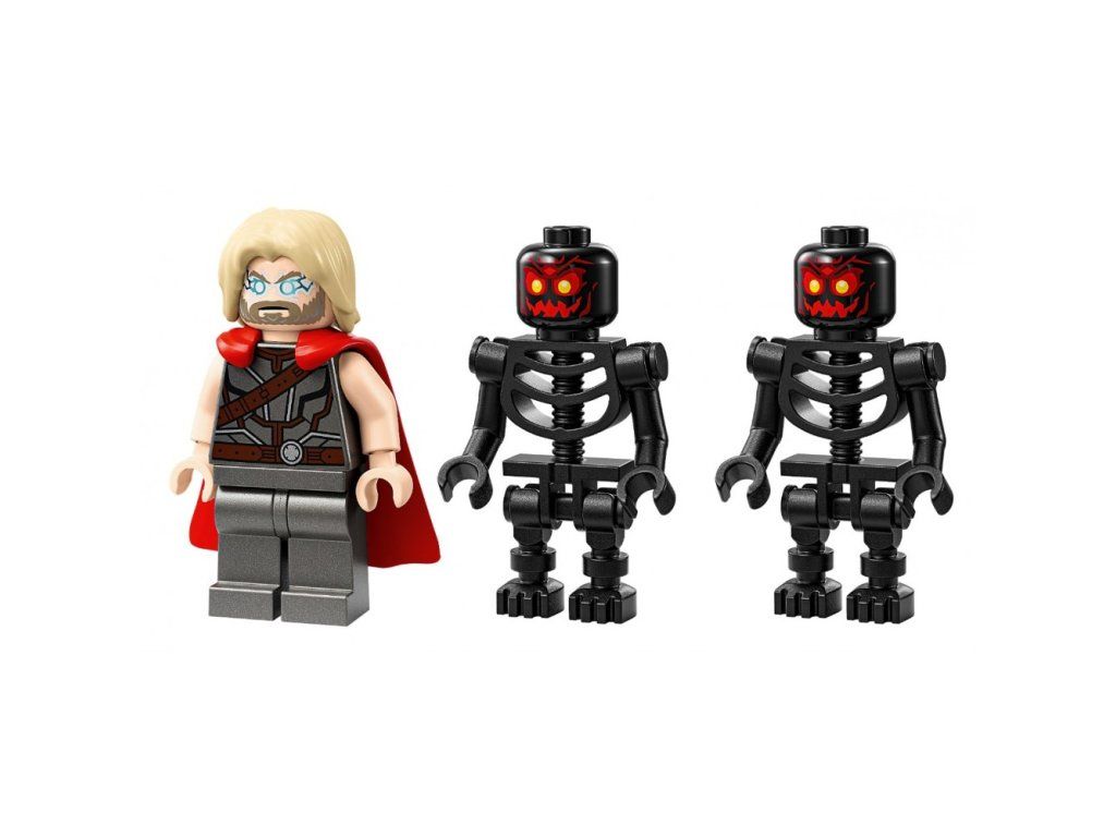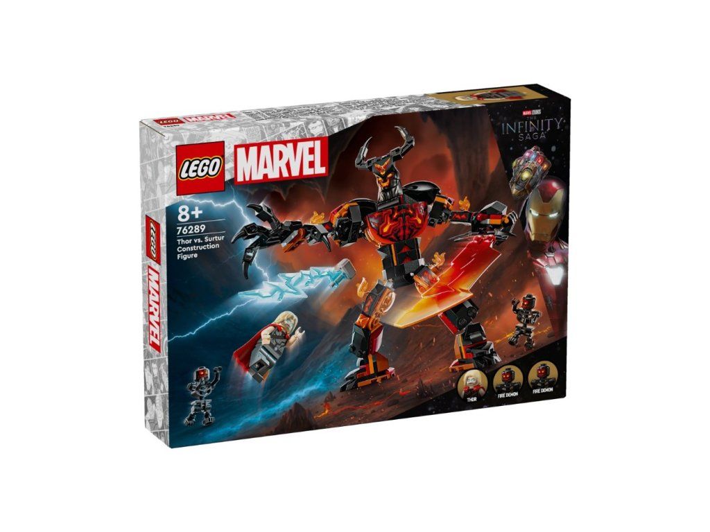• Sestavitelná postava od Marvelu – obsahuje minifigurku Thora a 2 minifigurky ohnivých démonů, a navíc sestavitelnou velkou kloubovou figurku Surtura s ohnivým mečem a rohatou korunou na hlavě