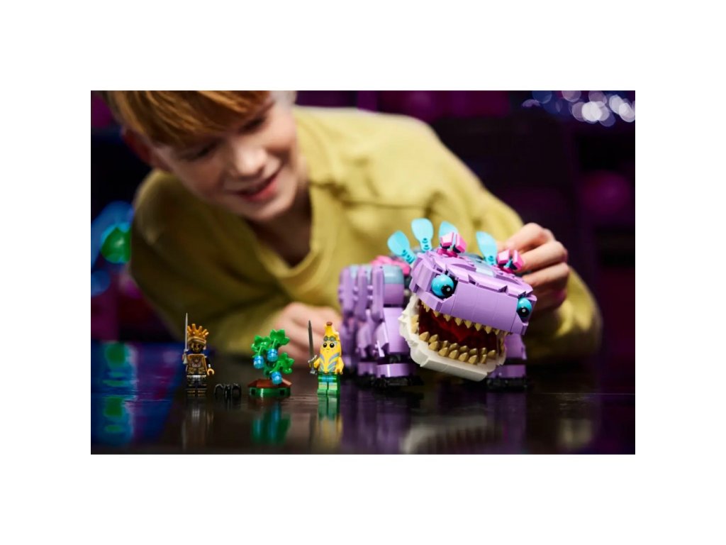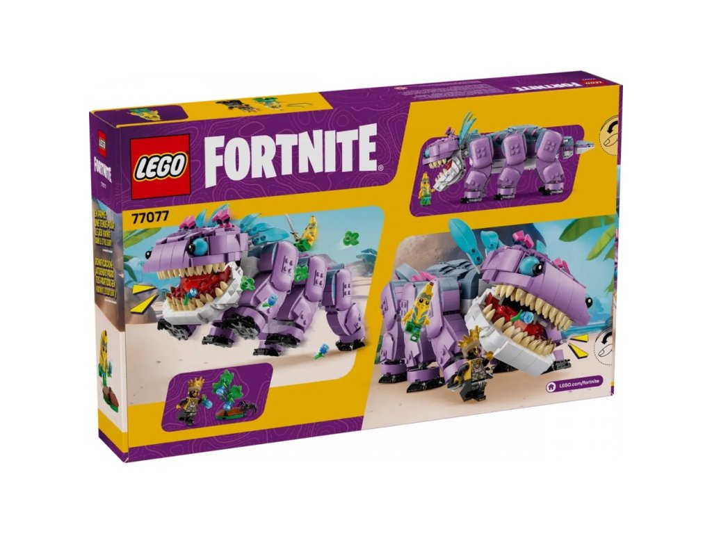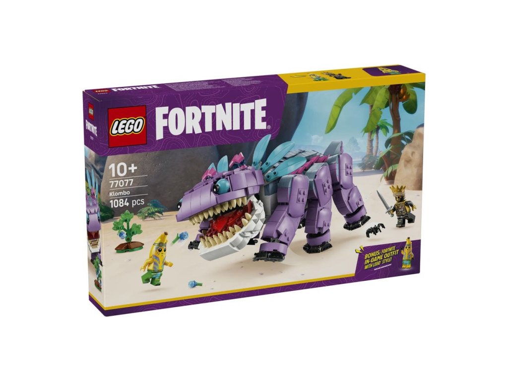 Fanoušci a gameři od 10 let si se stavebnicí LEGO® Fortnite® (77077) Klombo postaví kultovní postavu LEGO® Fortnite. Klombo je velké stvoření z videohry LEGO Fortnite a díky této stavebnici si ho holky a kluci můžou postavit z kostek LEGO. Děti siužijí spoustu zábavy při stavění modelu podle videohry Fortnite a objeví všechny jeho skvělé detaily, včetně pohyblivých nohou, otevírající tlamy a otáčejícího se ocasu. Součástí stavebnice je také malý keř Klomberry s odnímatelným ovocem Klomberries. Děti si tak můžou hrát na to, že Klomba vyruší, aby se naštval, a pak ho nakrmí ovocem, aby si Klomba udobřily. Stavebnice obsahuje také minifigurky Island Adventure Peelyho a Ora, které lze připevnit na záda Klomba a užít si s nimi tvořivé hraní na postavy. Tato úžasná stavebnice zvířátka poslouží jako krásný dárek pro gamery všech věkových kategorií a obsahuje skvělý digitální bonusový předmět. Hráči naskenují QR kód v návodu ke stavění a odemknou si outfit pro Island Adventure Peelyho ve videohře LEGO Fortnite. Stavebnice obsahuje 1084 dílků.
